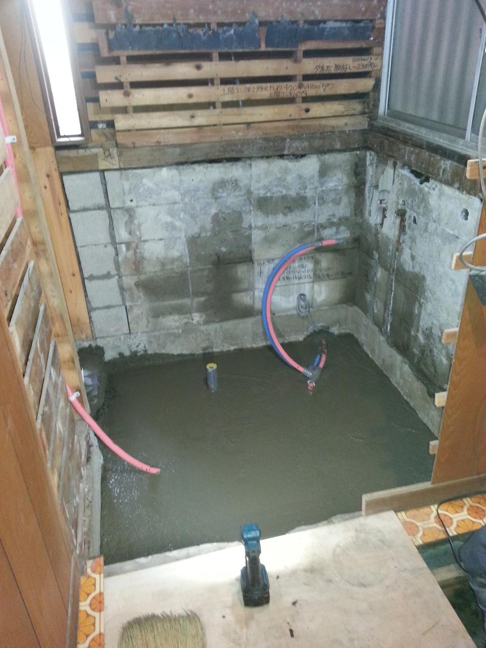 佐藤様浴室に、新しいユニットバスの配管、土間コンクリート打設完了です。 新しいユニットバス待ちです。