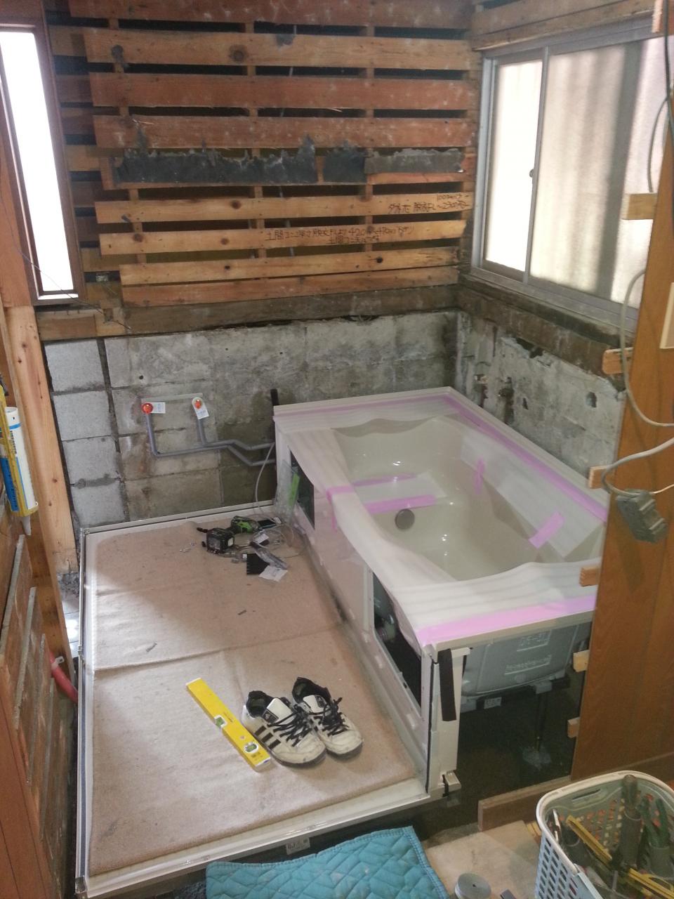 高崎市、佐藤様浴室床、浴槽設置施工中です。