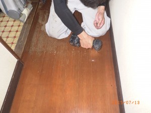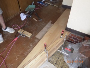 永く使用して来て床材が傷んで、上貼り前ビス増し絞め工程です、