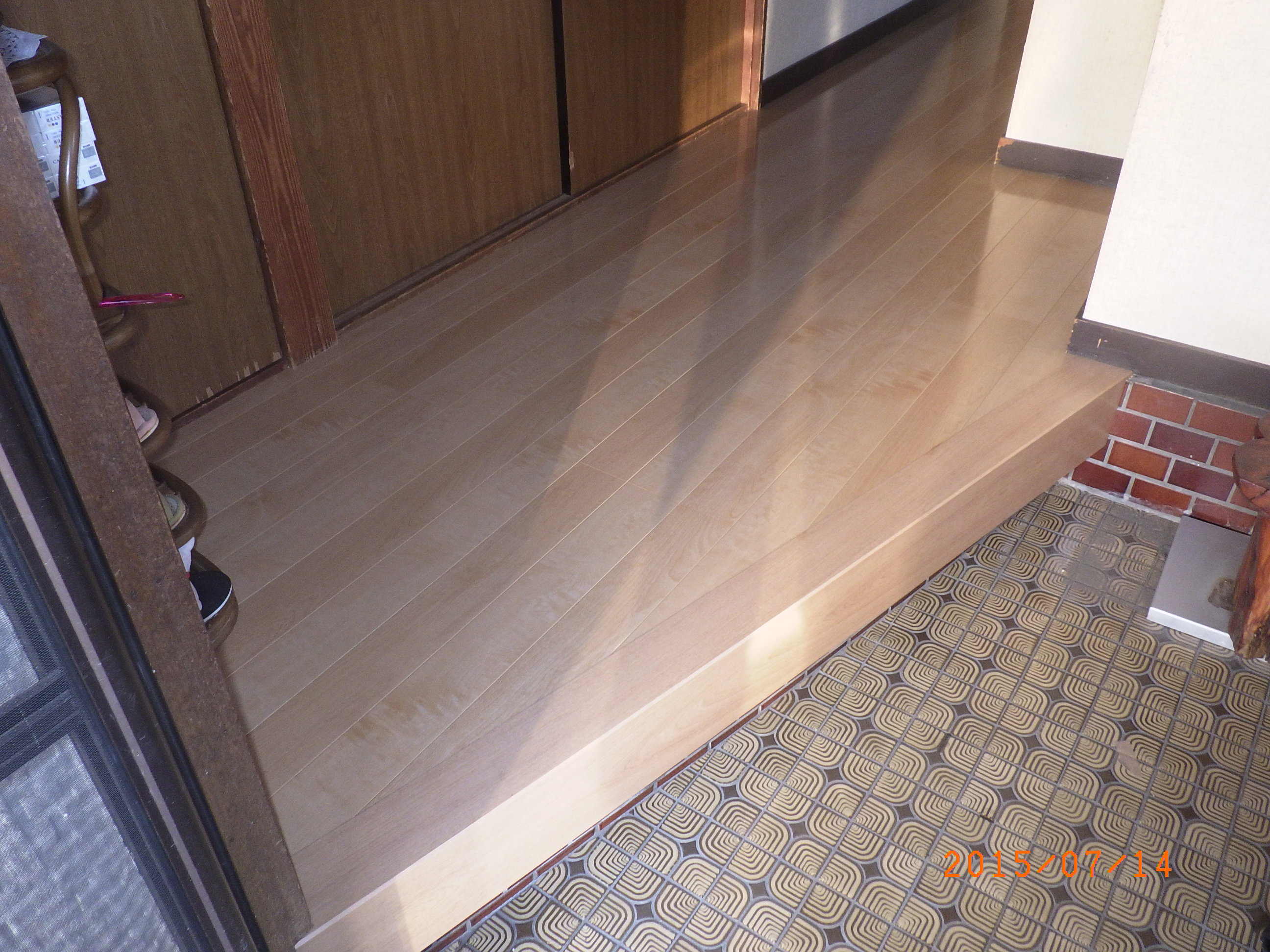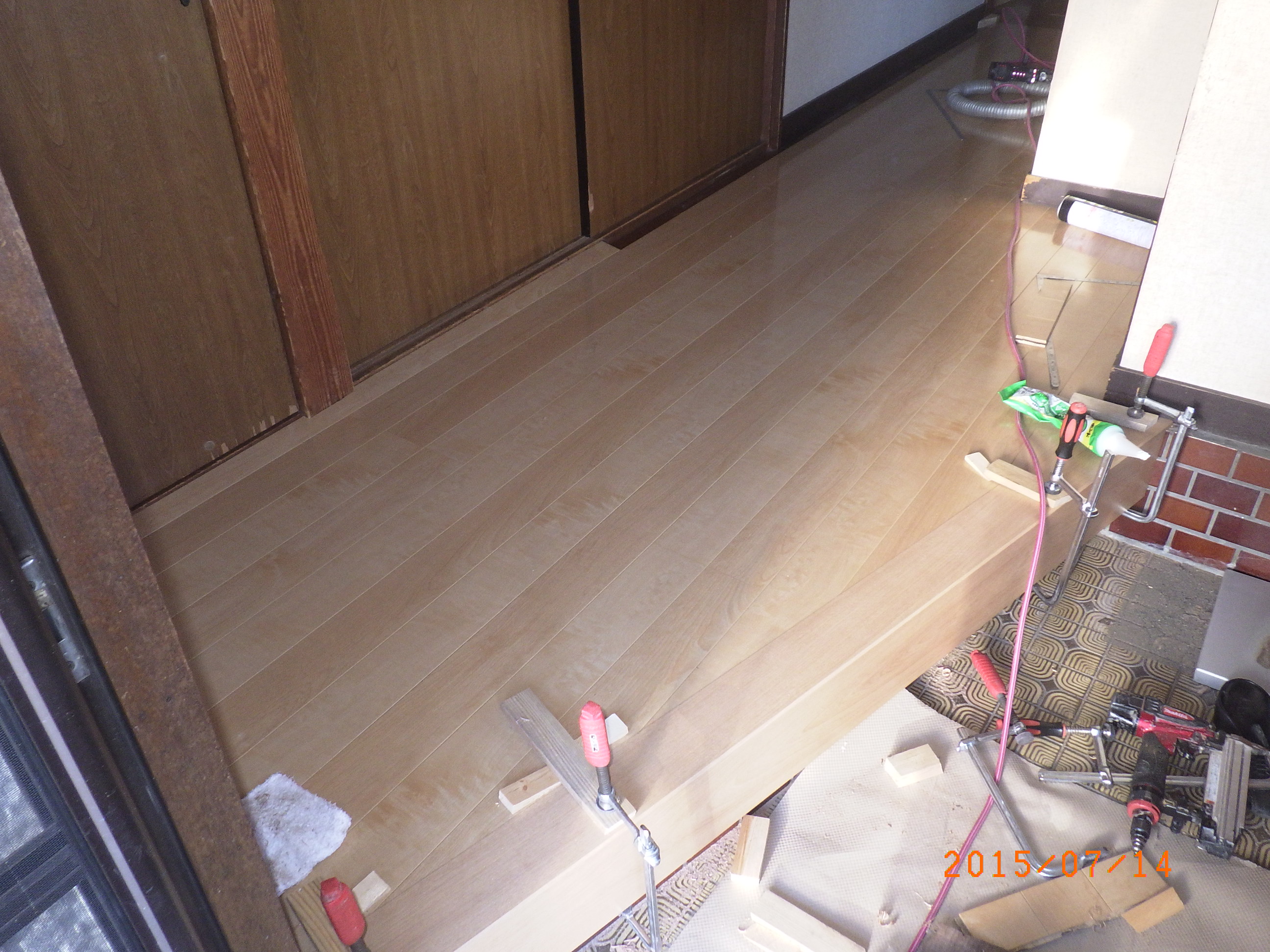 上り框を取り付けてこれから、フローリングを貼り始めます。